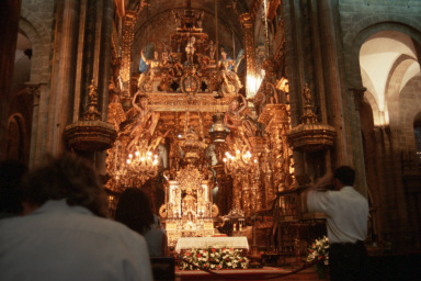 | 18:00 Uhr Pilgermesse mit Begrüßung der am Tage angekommenen Pilger Schwenken des großen Weihrauchfasses - 2004 ist Heiliges Jahr in Santiago |